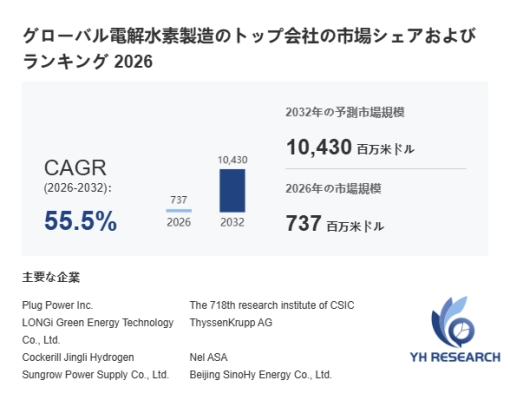 YHResearch調査チームの最新レポート「グローバル電解水素製造のトップ会社の市場シェアおよびランキング 2026」によると、2026年の737百万米ドルから2032年には10430百万米ドルに成長し、2026年から2032年の間にCAGRは55.5%になると予測されています。