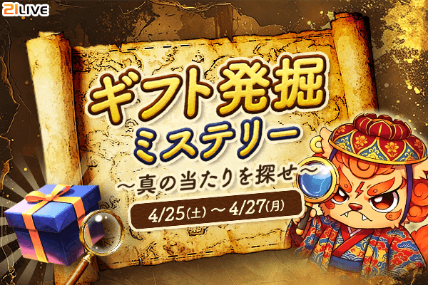 株式会社エムアンドティーティー(本社:沖縄県北谷町、代表取締役:井藤 三知子)が運営するエンターテイメント・ライブ配信アプリ【21LIVE(ニーイチライブ)】URL: https://21.live では、4月25日(土)より『ギフト発掘ミステリー』を開催します。