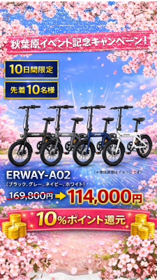 鑫三海株式会社(本社:大阪府堺市堺区、代表取締役:伴場 義通)は2026年4月18日(土)・19日(日)にヨドバシAkiba店にて開催される電動アシスト自転車「ERWAY(イーアールウェイ)春の大試乗会」に伴い、ERWAYの人気モデル、ERWAY-A01とERWAY-A02の各モデル限定10台を超特価で販売いたします。