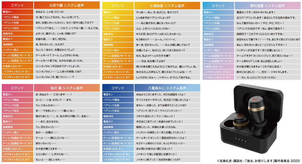 本モデルには、水原千鶴(CV:雨宮 天)、七海麻美(CV:悠木 碧)、更科瑠夏(CV:東山奈央)、桜沢 墨(CV:高橋李依)、八重森みに(CV:芹澤優)の録り下ろし音声ガイダンスを搭載。また、充電ケースには作品名と各キャラクター名を、イヤホン本体には各キャラクターのモチーフを配置し、作品の世界観を表現しています。