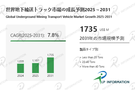 LP Information調査チームの最新レポートである「世界地下輸送トラック市場の成長予測2025~2031」(https://www.lpinformation.jp/reports/596558/underground-mining-transport-vehicle)によると、2025年から2031年の予測期間中のCAGRが7.8%で、2031年までにグローバル地下輸送トラック市場規模は17.35億米ドルに達すると予測されている。こうした拡大の背景には、資源価格の上昇、鉱物原料需要の高まり、都市化・インフラ整備の加速、ならびにエネルギー/資源安全保障への関心の高まりがある。また、鉱山業のみならずトンネル掘削、地下インフラ整備、地下建設などの用途が拡大しており、地下輸送トラックの需要は鉱業にとどまらず多用途化の兆しを見せている。さらに、持続可能性や安全性への関心の高まり、そして労働力確保の難しさから、より堅牢で高効率、安全性を備えた地下輸送トラックへの投資意欲が強まっており、これが市場拡大のもうひとつの強い後押しとなっている。