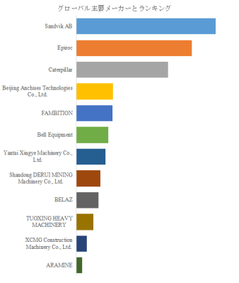 アジア太平洋および新興国地域では、資源開発とインフラ建設の増加に伴い、中国企業や地場メーカーがコスト競争力と地域密着性を武器にシェアを伸ばしている。一方、欧州、北米、オーストラリアなど成熟市場では、Sandvik や Epiroc のような高信頼性・高品質な機器を提供する企業が、坑道の安全性、作業効率、耐久性を重視する鉱山会社やトンネル建設事業者からの支持を得ている。特に Caterpillar は、従来型ディーゼルトラックに加え、電動化・モジュラー設計を取り入れた次世代プラットフォームを明示しており、北米および豪州などでの脱炭素・効率化ニーズに応える製品展開を進めている。こうした二極化した市場構造の中で、コスト重視の国・地域では価格競争力、成熟国では性能と信頼性、それぞれが求められる価値を提供する企業が台頭している。