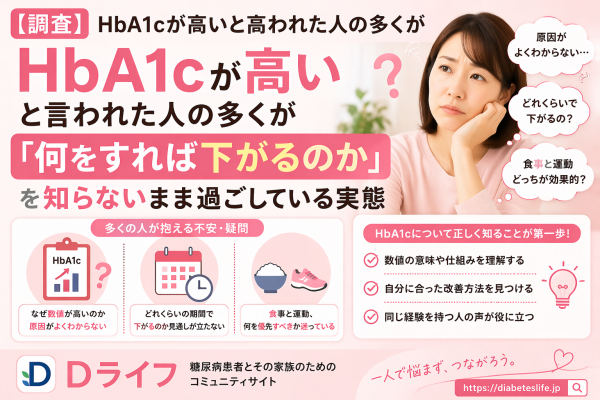 糖尿病患者とその家族のためのコミュニティサイト『Dライフ( https://diabeteslife.jp )』を運営する合同会社MYASIA Entertainmentは、このたびHbA1cの数値に関する相談傾向と検索動向をもとに、ユーザーの声を整理した調査結果をまとめました。健康診断でHbA1cの高さを指摘された後、改善方法や数値の見方について情報を探し続けている方が多く、「どれくらいの期間で下がるのか」「食事と運動のどちらが効果的か」といった疑問が解消されないまま日常を送っているケースが少なくないことがわかってきました。