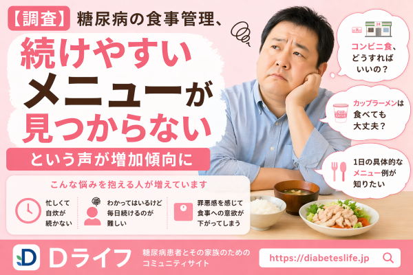 糖尿病患者とその家族のためのコミュニティサイト『Dライフ( https://diabeteslife.jp )』を運営する合同会社MYASIA Entertainmentは、このたび糖尿病における日常の食事管理に関する相談傾向と検索動向をもとに、ユーザーの声を整理した調査結果をまとめました。朝・昼・夜の具体的なメニューや、コンビニ食・カップラーメンとの付き合い方について悩む方が増えており、「わかってはいるけど続けられない」という切実な声が多く寄せられています。