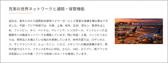 本ページでは、半導体や医療機器、重量物など、高い品質管理と迅速性が求められる貨物に対応する当社の「国際航空輸送サービス」について、対応エリアや物流体制、取り組み事例などを分かりやすく紹介しています。