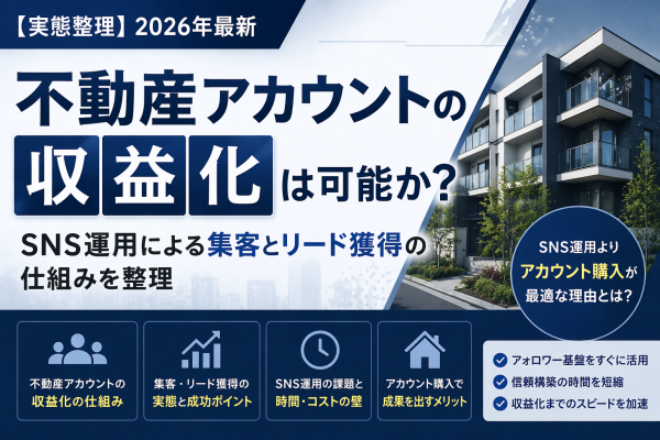 不動産アカウントはSNS運用によって収益化が可能な領域ですが、その本質は「フォロワー数」ではなく「リード獲得導線」と「信頼性」にあります。ゼロからSNS運用を行う場合、時間とコストがかかる一方で、すでに基盤が整っているアカウントを活用することで、収益化までのスピードを大きく短縮できる可能性があります。今後は「育てる」だけでなく「購入して活用する」という選択肢がより一般化していくと考えられます。