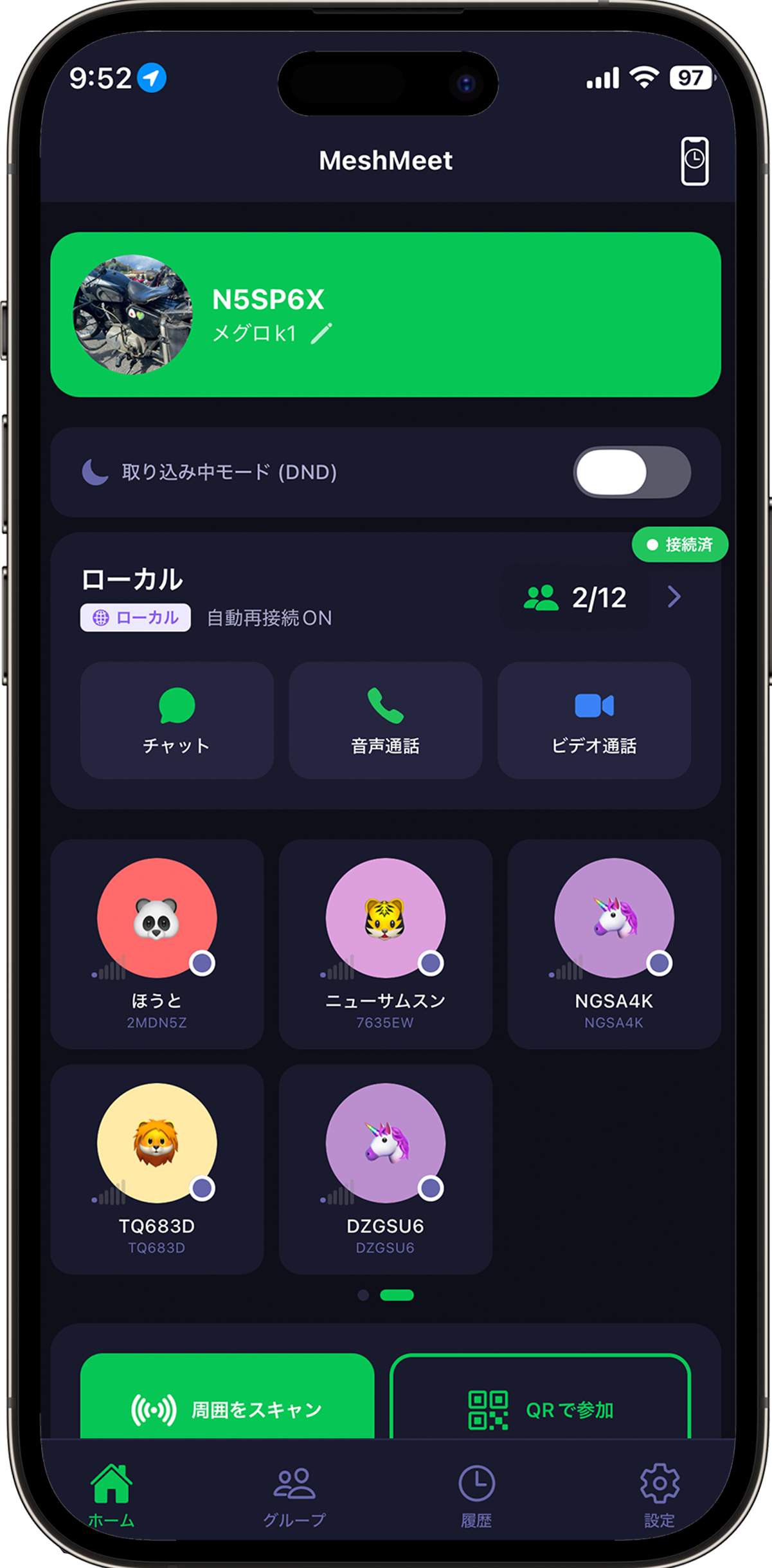 地震や台風などの自然災害による通信障害、あるいは通信検閲が行われる地域において、既存のSNSや通話アプリは無力化されます。MeshMeetは、中央サーバーや通信キャリアに依存せず、端末同士が直接つながることで、どのような環境下でも「大切な人の顔を見て話せる」安心を提供するために開発されました。