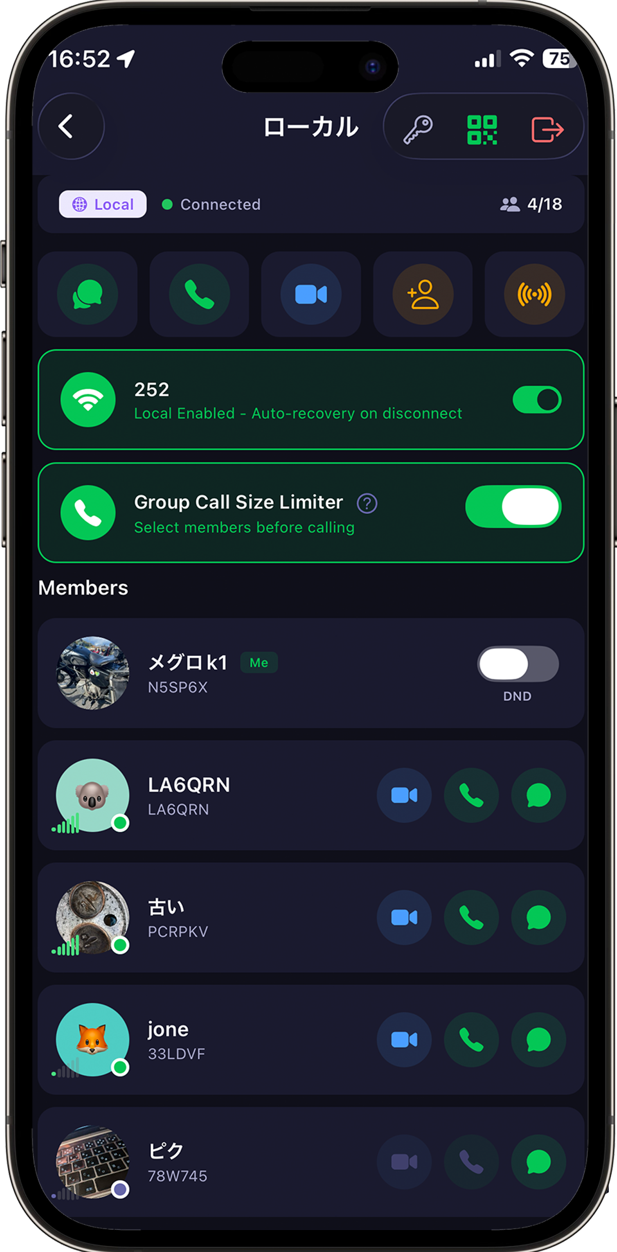 状況に応じて、ビデオ通話、音声のみの通話、そしてメッシュ通信によるテキストメッセージを使い分けられます。まさに「スマホ一台で完結する次世代トランシーバー(インカム)」として、プロユースからレジャーまで幅広く対応します。