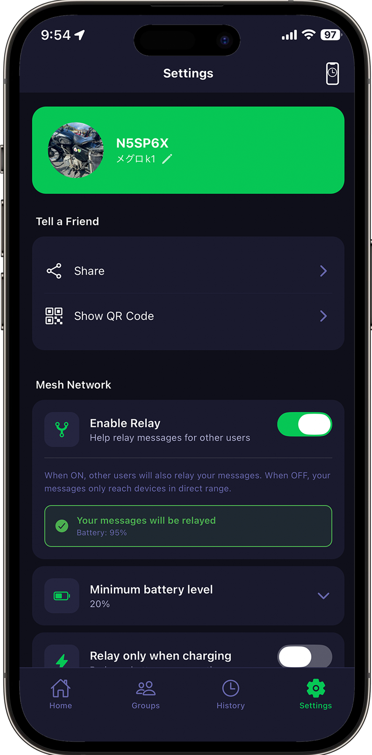 Bluetooth Low Energy(BLE)を活用し、周囲のユーザーが電波を中継。最大7段階先(7ホップ)の相手まで、バケツリレー方式で確実にメッセージを届けます。