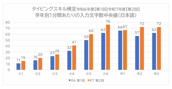 株式会社教育ネット(神奈川県横浜市都筑区 代表:大笹いづみ)と株式会社ミラボ(東京都千代田区 代表:谷川一也)が共同開発した情報活用能力の可視化・育成を目的としたWEBアプリケーション『らっこたん』を使用した『令和7年度 第2回タイピングスキル検定』の結果を公開しました。本検定は2025年11月4日~2026年2月27日までに実施し、日本全国の児童生徒52,001人が参加。1分間あたりの入力文字数の中央値は令和6年第1回と比較すると全学年で増加し、小学5年生と中学3年生は10文字、小学6年生は14文字の増加となりました。