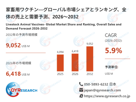 QYResearch調査チームの最新レポート「家畜用ワクチン―グローバル市場シェアとランキング、全体の売上と需要予測、2026~2032」によると、家畜用ワクチンの世界市場は、2025年に6094百万米ドルと推定され、2026年には6418百万米ドルに達すると予測されています。その後、2026年から2032年にかけて年平均成長率(CAGR)5.9%で推移し、2032年には9052百万米ドルに拡大すると見込まれています。