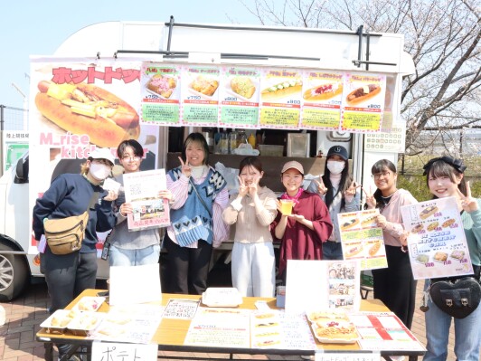 もうひとつは、有志で集まった本学こども心理学部・モチベーション行動科学部合同の商品開発プロジェクトチームによる「M_rise kitchen car」。あんバターホットドックや「しば」マヨポテトなど、発想力を活かしたオリジナルメニューを展開し、多くの来場者でにぎわいました。
