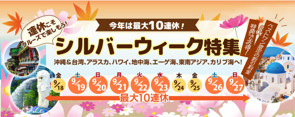 2026年のシルバーウィークは、平日を3日休むと最大10連休となり、真夏を避けて観光しやすい時期に長期休暇を活用した旅行需要の高まりが見込まれています。一方で、連休の時期はすでに予約で混んでおり、現在ご案内可能なクルーズも限られてきています。