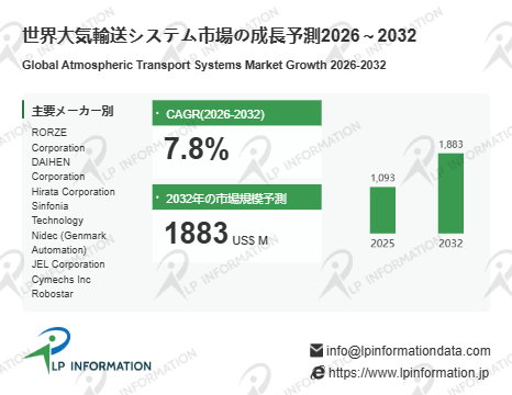 LP Information調査チームの最新レポートである「世界大気輸送システム市場の成長予測2026~2032」(https://www.lpinformation.jp/reports/586920/atmospheric-transport-systems)によると、2026〜2032年の予測期間中に大気輸送システム市場は年平均成長率(CAGR)7.8%で拡大し、2032年には市場規模が18.83億米ドルに達する見込みである。半導体産業全体の微細化、高集積化、3次元積層、異種集積の進展に伴い、ウェーハ搬送の自動化および清浄性維持の重要性が高まっており、大気輸送システムへの需要が安定的かつ持続的に増加している。また、半導体ファブの新設や設備更新が世界各地で進んでおり、成熟市場だけでなく新興地域でも搬送インフラ導入が進展している。これにより、大気輸送システムは単なるニッチ装置ではなく、半導体製造全体の基盤を支える汎用システムとして受け入れられ、市場全体の裾野拡大が明確となっている。搬送装置市場の成長は、量産対応、自動化の加速、歩留まりと信頼性の要求の高まりと密接に連動しており、今後も安定的な成長が見込まれる。