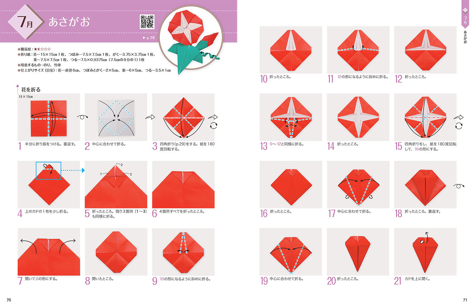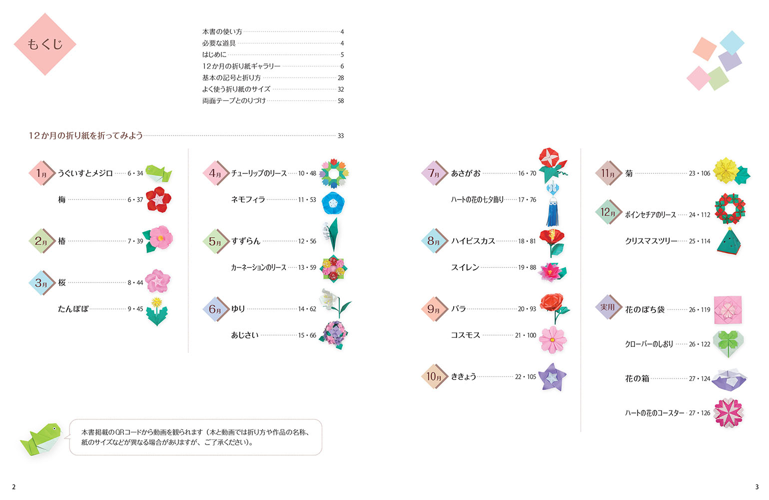 春の訪れを感じる梅や桜、夏の風物詩のあさがお、秋冬の季節を彩る花々まで、著者オリジナルの美しい花の折り紙作品を12か月に分けて紹介。季節ごとに楽しみながら、一年を通して花折り紙の魅力を味わえます。