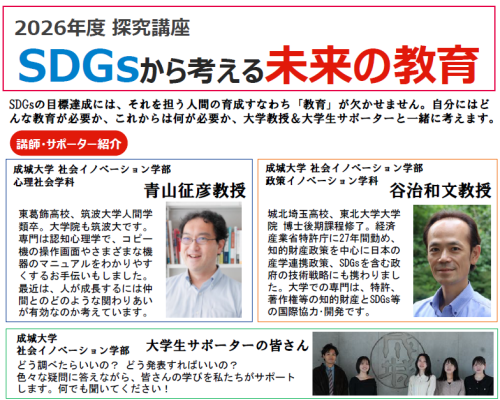 株式会社城南進学研究社(本社:神奈川県川崎市、代表取締役社長CEO:千島 克哉)は、運営する個別指導塾「城南コベッツ」と総合型・学校推薦型選抜対策専門「城南推薦塾」において、2026年5月30日(土)・6月27日(土)・7月18日(土)に、成城大学とのコラボレーション講座で、新しい価値観・世界観を創造する力を鍛える探究講座「SDGsから考える未来の教育」を開催します。