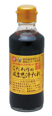 北海道産丸大豆しょうゆをベースに、玉ねぎ、高知県産しょうがの野菜の旨味とすりおろし感を合わせ、余市産りんごや瀬戸内産レモンなどを使用してフルーティーな味わいに仕上げました。さらに、北海道産米を使用した純米酢でまろやかな酸味、「オホーツクの塩」を使用して優しい塩味を付与した、北海道ジンギスカンフェスティバルのためだけに作った、こだわりの成吉思汗たれです。