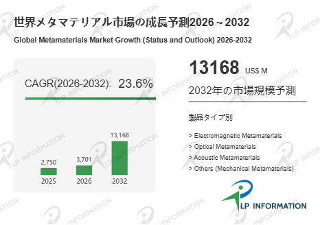 LP Information調査チームの最新レポートである「世界メタマテリアル市場の成長予測2026~2032」(https://www.lpinformation.jp/reports/583157/metamaterials)によると、グローバルメタマテリアル市場は、2026~2032年のCAGRが23.6%と非常に高く、2032年には131.68億米ドルに達すると予測されている。この市場の特徴は、通信、航空宇宙、防衛、医療、光学デバイスなど多様な先端技術分野への応用需要が顕著である点である。特に高周波通信や次世代センサー、量子技術の開発において、メタマテリアルは従来材料では得られない機能性を提供することから、研究開発投資が集中的に行われている。市場規模はまだ相対的に小さいものの、技術革新の速度と応用領域の広がりにより、高付加価値市場として成長性が極めて高い特徴を持つ。さらに、製造プロセスの標準化やモジュール化が進むことで、産業化・量産化の可能性も拡大している。