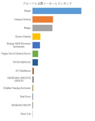 地域別に見ると、北米および欧州市場では、新生児医療体制が高度に整備されており、経皮ビリルビン測定器は既に標準的な診断補助機器として広く普及している。これらの地域では新規導入よりも、更新需要や上位機種への切り替えが市場を支えている。一方、アジア太平洋地域では出生数の多さと医療インフラ整備の進展を背景に、導入フェーズにある医療機関が多く、中長期的な成長余地が大きい。中国を中心とした新興市場では、価格競争力を持つローカルメーカーの存在感が増しており、市場構造に多様性をもたらしている。企業別では、Drägerを筆頭に、Mennen Medical、Philips、Konica Minoltaなどがグローバル市場で高い認知度を有し、技術力とブランド信頼性を武器に安定したポジションを確立している。上位企業は製品ラインアップの拡充と地域戦略の最適化を通じて、市場の成熟化に対応している。