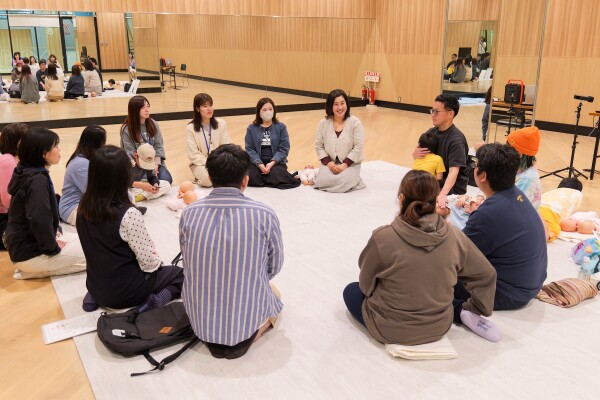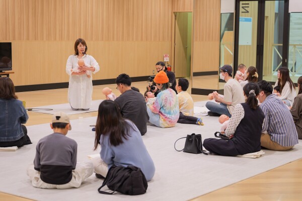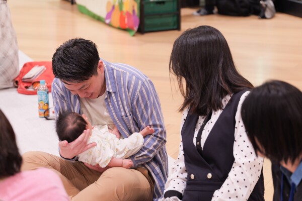 赤ちゃんの抱き方:首がすわる前は首のサポートが重要。まずは後頭部の「ぼんのくぼ」を親指と人差し指で支え、手のひら全体で背中の辺りを支える基本の形を練習。次に赤ちゃんが安心する「丸い抱っこ」を実践しました。最初は緊張で肩に力が入っていたパパたちも、お歌を歌いながら練習するうちに自然と笑顔があふれ、会場が和やかなムードに包まれました。