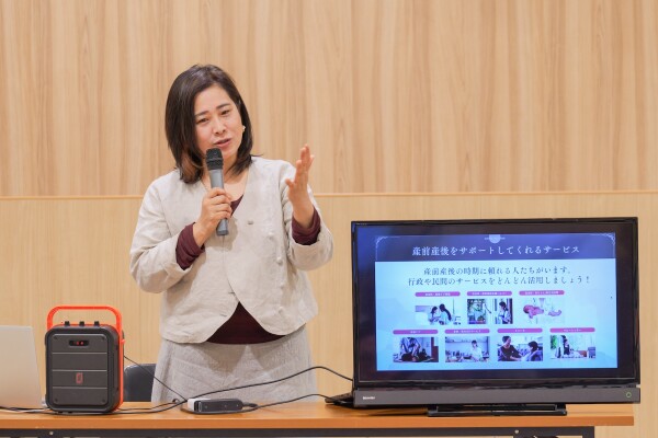 前半は、当法人代表理事・高橋由紀が登壇。産前産後の身体の整え方や赤ちゃんの抱き方について、実技を交えた体験型のレクチャーを行いました。