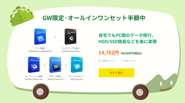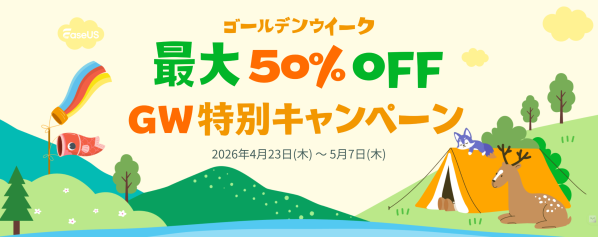 EaseUS Software Co., Ltd.は、2026年4月23日(木)から5月7日(木)まで、「GW特別キャンペーン」を開催いたします! 今度は人気製品が最大50%OFFとなるほか、クーポンコードの配布や、オールインワン製品バンドルの特別割引など、多彩なオファーをご用意しております。期間限定のスペシャルオファーをぜひお見逃しなく!