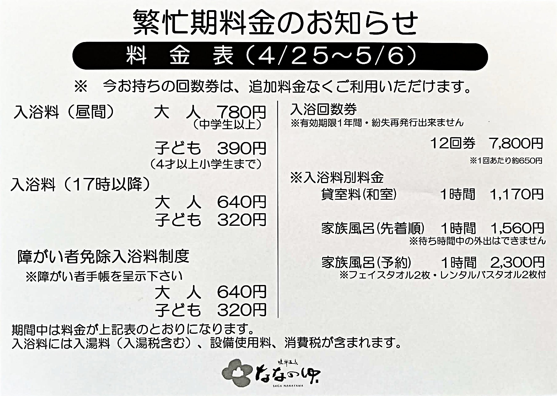ななのゆは4月25日から5月6日の間は休館日を設けず休まず営業いたしますが、一部繁忙期特別料金となりますのでお知らせいたします。