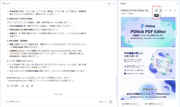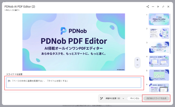 このように、PDNobを使えばNotebookLMスライドを「再生成に頼らず」直接編集できるため、実務用途でも扱いやすいのが大きな強みです。