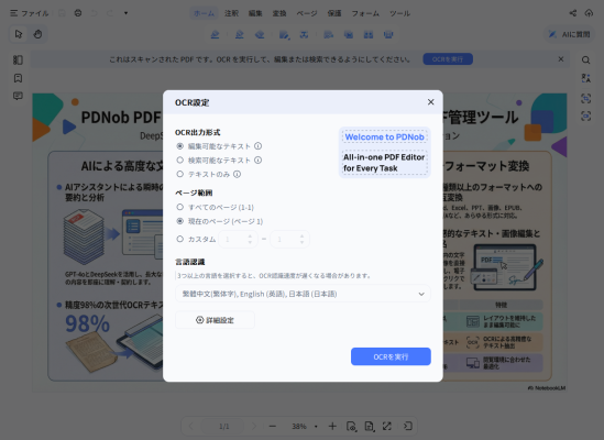 PDNob PDFソフトは、AI-OCR技術を活用したPDF編集ツールで、NotebookLMのような「画像ベースのスライド」を編集可能な状態に変換できるのが特徴です。