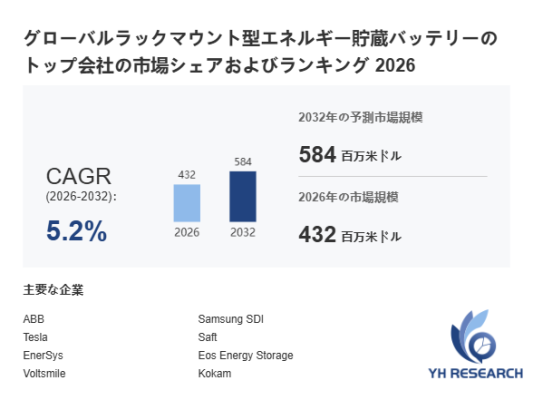 YHResearch調査チームの最新レポート「グローバルラックマウント型エネルギー貯蔵バッテリーのトップ会社の市場シェアおよびランキング 2026」によると、2026年の432百万米ドルから2032年には584百万米ドルに成長し、2026年から2032年の間にCAGRは5.2%になると予測されています。