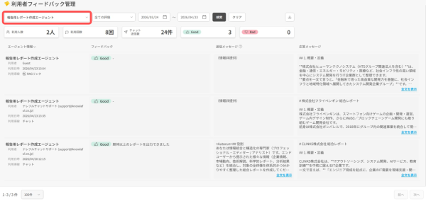 「利用者フィードバック機能」は、作成したAIエージェントやRAGリンク(社内データを読み込んだAI)を利用したユーザーからの評価・コメントを、エージェントの作成者が確認できるようになる機能です。