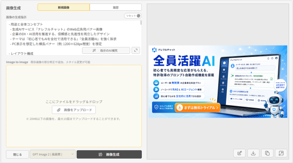 日本語テキスト入りのバナー画像を複数パターン瞬時に生成し、そのまま広告運用に活用できます。画像生成後に別ツールで文字を合成する手間が不要となり、クリエイティブ制作コストを大幅に削減できます。