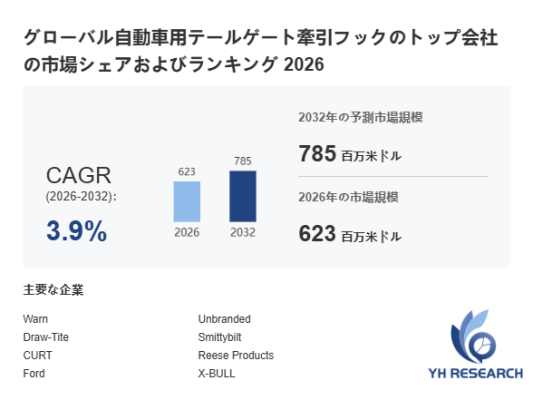 YHResearch調査チームの最新レポート「グローバル自動車用テールゲート牽引フックのトップ会社の市場シェアおよびランキング 2026」によると、2026年の623百万米ドルから2032年には785百万米ドルに成長し、2026年から2032年の間にCAGRは3.9%になると予測されています。