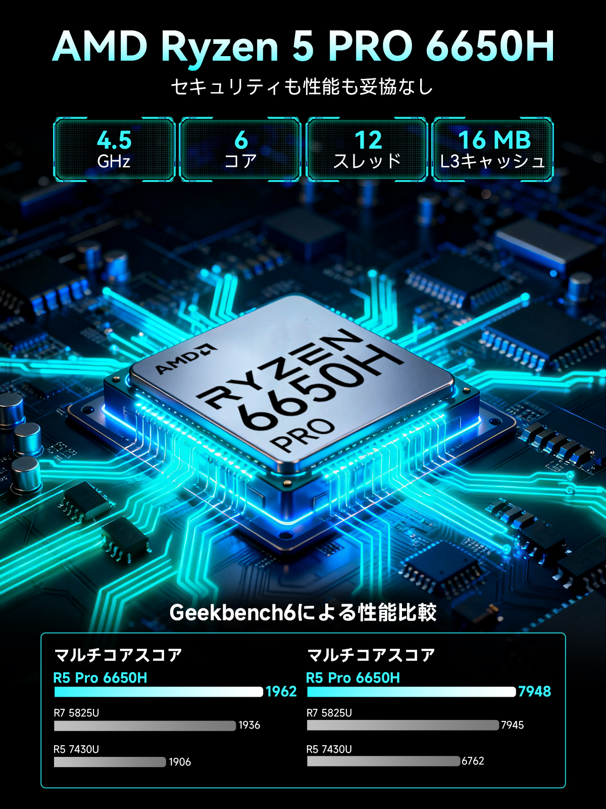 GMKtec M8 は、AMD Ryzen™ 5 PRO 6650Hを搭載した高性能ミニPCです。6コア12スレッド、最大4.5 GHz動作の高性能CPUと16 GBの大容量メインメモリ、512 GBのM.2 PCIe 3.0 高速SSDを搭載することで画像や動画編集なども快適に行えます。HDMIとDisplayPort、USB4端子を組み合わせて最大3画面同時出力に対応し、在宅ワークのようなビジネスからプライベートまで、省スペースで生産性を最大限に高めることができます。