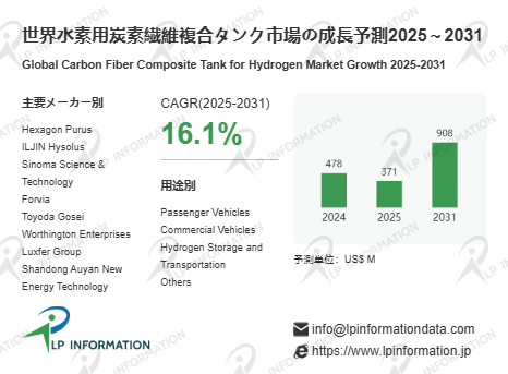 LP Information調査チームの最新レポートである「世界水素用炭素繊維複合タンク市場の成長予測2025~2031」(https://www.lpinformation.jp/reports/598978/carbon-fiber-composite-tank-for-hydrogen)によると、グローバル水素用炭素繊維複合タンク市場は2025~2031年にかけてCAGR16.1%で拡大し、2031年には市場規模が9.08億米ドルに到達すると予測されている。これは単なるモビリティ向け需要の増加にとどまらず、水素ステーション向け蓄圧装置、産業用途の高圧輸送ボトル、分散型エネルギーシステム向け貯蔵設備など、多面的なアプリケーション拡張が市場成長を牽引しているためである。特にアジア・欧州ではFCEVバスや大型トラックでの採用が加速し、従来の金属タンクに代わり、より高い強度重量比を有するCFRPタンクへの置き換えが本格化している。また、主要OEMと複合材料メーカーの戦略的パートナーシップが連続的に発表され、サプライチェーンの統合が進むことで生産効率の向上とコスト低減も急速に進展している。これにより、同市場は成長軌道を確実に上方シフトしつつある。
