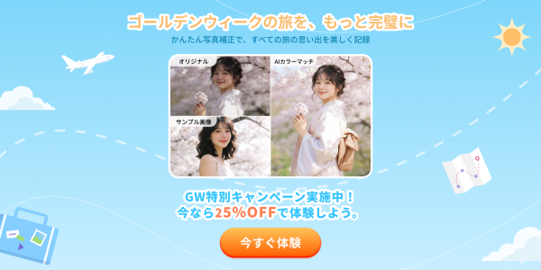 ゴールデンウィークの思い出は、時間が経つほど価値が増していきます。だからこそ、写真は“自然で美しい状態”で残しておきたいものです。PixPrettyなら、AIによって誰でも簡単に、美肌アプリで自然な仕上がりを実現できます。特に「AIカラーマッチ」による色味再現は、理想の一枚に近づける新しい方法として注目されています。25%OFFキャンペーンは5月8日まで。