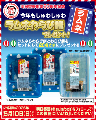 このたび、東日本地域でのラムネわらび餅の発売を記念してキャンペーン「今年もしゅわしゅわ!ラムネわらび餅プレゼント!」を開始しました。キャンペーンの開催期間は2026年4月27日から5月10日までとなります。