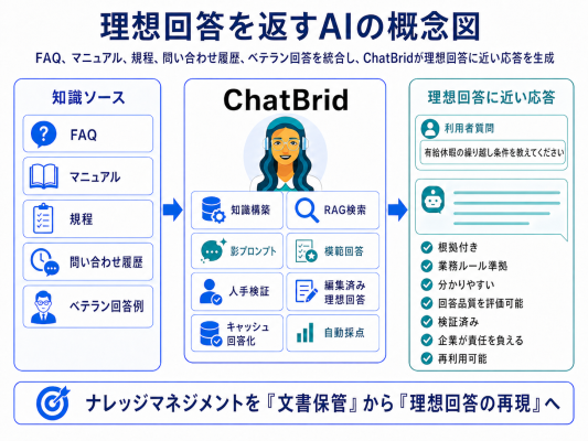 「ナレッジマネジメントの最終目的は、文書を保存することではありません。必要な場面で、正しい判断と回答を再現することです。ChatBridは、社内に眠る知識を“探せる情報”から“理想回答を返すAI”へ変換し、企業の知識活用を実務レベルで支援します。