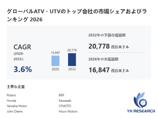 YHResearch調査チームの最新レポート「グローバルATV・UTVのトップ会社の市場シェアおよびランキング 2026」によると、2026年の16847百万米ドルから2032年には20778百万米ドルに成長し、2026年から2032年の間にCAGRは3.6%になると予測されています。