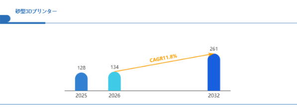Global Reports調査チームの最新レポート「グローバル砂型3Dプリンター市場規模、主要企業シェア、ランキング分析レポート【2026年版】」によると、2026年の134百万米ドルから2032年には261百万米ドルに成長し、2026年から2032年の間にCAGRは11.8%になると予測されています。