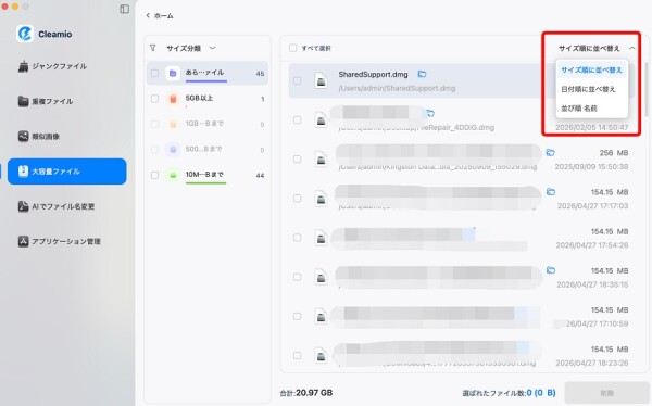 1. Cleamioを立ち上げ、「大容量ファイル」から検索を開始する
