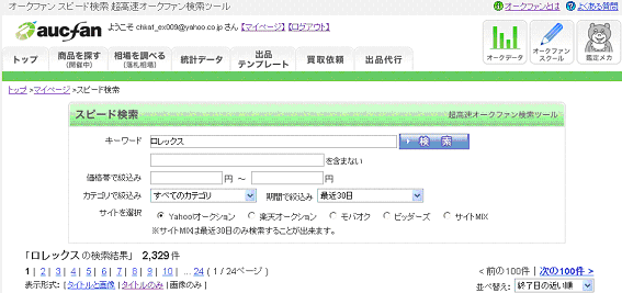 「スピード検索」は、オークションでの相場検索をシンプルかつスピーディに検索・一覧表示する検索ツールです。