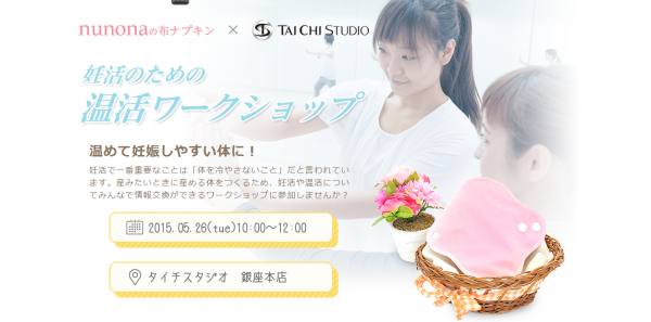 株式会社シー・コネクト(本社:東京都文京区)が運営する、不妊や冷え・生理痛に悩む女性のための生理用布ナプキン専門の通販サイト「nunona(ヌノナ)の布ナプキン」(以下、nunona)が、現代版太極拳の「タイチ」とコラボして、2015年5月26日(火)、「妊活のための温活ワークショップ」を開催します。