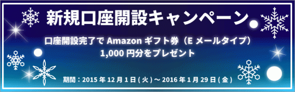 外為ファイネスト株式会社(本社:東京都千代田区、代表取締役:石野由美子)は、2015年12月1日より、FX口座を新規開設したお客様にもれなくAmaoznギフト券1,000円分をプレゼントするキャンペーンを開始いたしました。