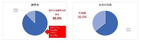 「やまとごころキャリア」の登録会員は、インバウンドに対する志が高く、インバウンド関連への就労のみを希望している人が全体の約80%を占めています。また、英語、中国語など活かせる語学力を有している人は、全体の約90%となっています。中には、英語・中国語・日本語の三カ国語が使える人材も登録しており、外国籍の会員は全体の30%以上を占めています。