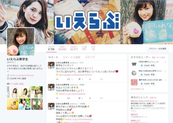 またいえらぶ美学生公式Twitter (@ielove_t)では、サイトの更新情報に加え、Twitter限定企画を用意し、現在35,000を超えるフォロワーに支持されています。