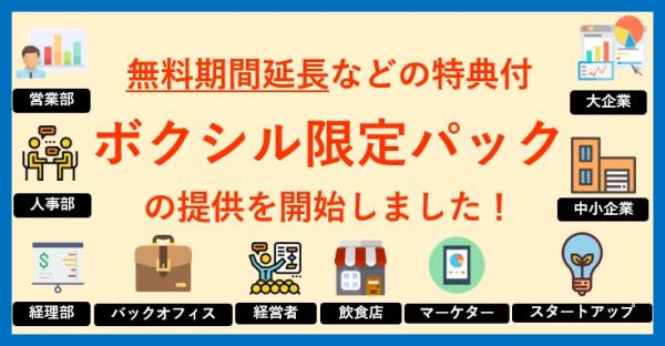 カテゴリー追加と同時にボクシルでは、より会員の方にサービス導入するメリットを提供できるよう、会員限定で、各種サービスの無料期間を延長できる、ボクシル限定パックの提供をスタートいたしました。今回、提供を開始するパックは全10種類。各部署、職種、部署、会社規模にあったパッケージをご用意いたしました。