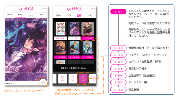 『Selepo.me』 ( https://selepo.me/ )は、社内で開発した独自のシステムにより、お客様ひとりひとりの好みに合わせたカレンダーを注文から生産・発送までワンストップで提供する業界初のWEBサービスです。