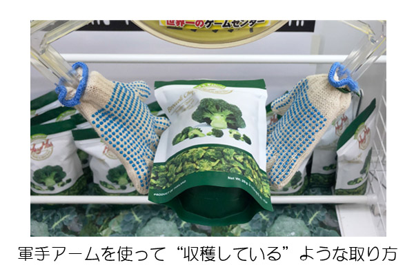 ブロッコリーキャッチャーは、景品やその誕生秘話だけでなく、台にもこだわり、景品を置く部分には、ブロッコリーがなっている畑の“うね”の写真を貼り、ブロッコリー畑を再現させました。そして、アームの部分を手の形にし、軍手をはめることで、まるで“ブロッコリーを収穫している”ように取ってもらう工夫も施した台になっております。