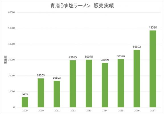 青唐うま塩ラーメンは、2009年より、一部店舗で販売を開始し、坂内として初めて「辛いラーメン」に挑戦をしました。味の特徴から、「辛さの苦手な方は注文しない」商品ではあり、これまで販売した限定商品ほどの販売数には及びませんでした。販売から10年、現在では、青唐うま塩ラーメンの販売の時期にしか来店されないお客様もいらっしゃるほどとなり、リピーターの多い冬の人気商品となっています。